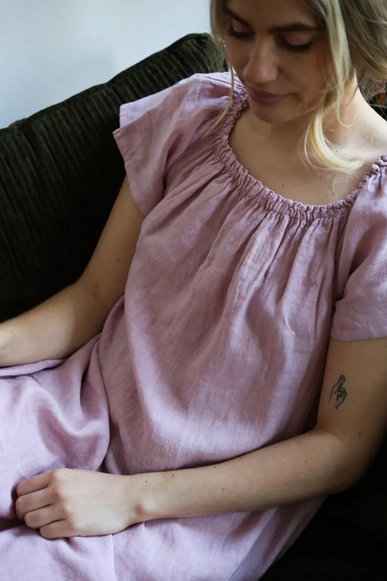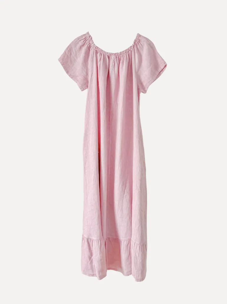 En feminin och luftig klänning i linne, med en romantisk off-shoulder-design och vackert fall. Perfekt för varma sommardagar eller en stilfull kvällslook. Finns i härliga färger för en fräsch och livlig garderob!