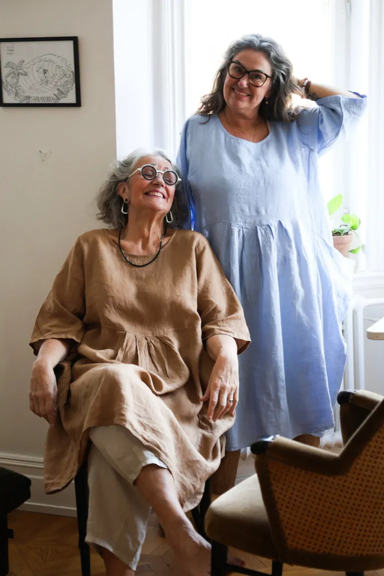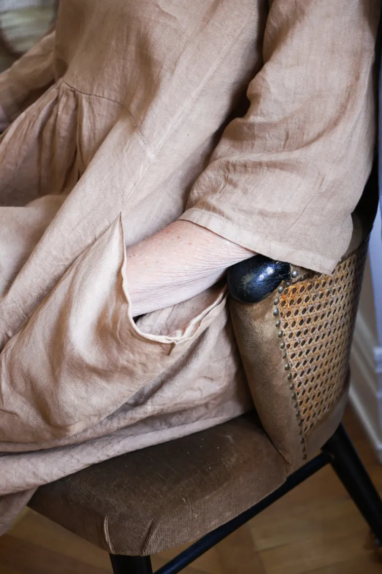 En underbart skön och lutfig linnenklänning med u-ringning, stora härliga fickor och veckad midja för ett fint fall!