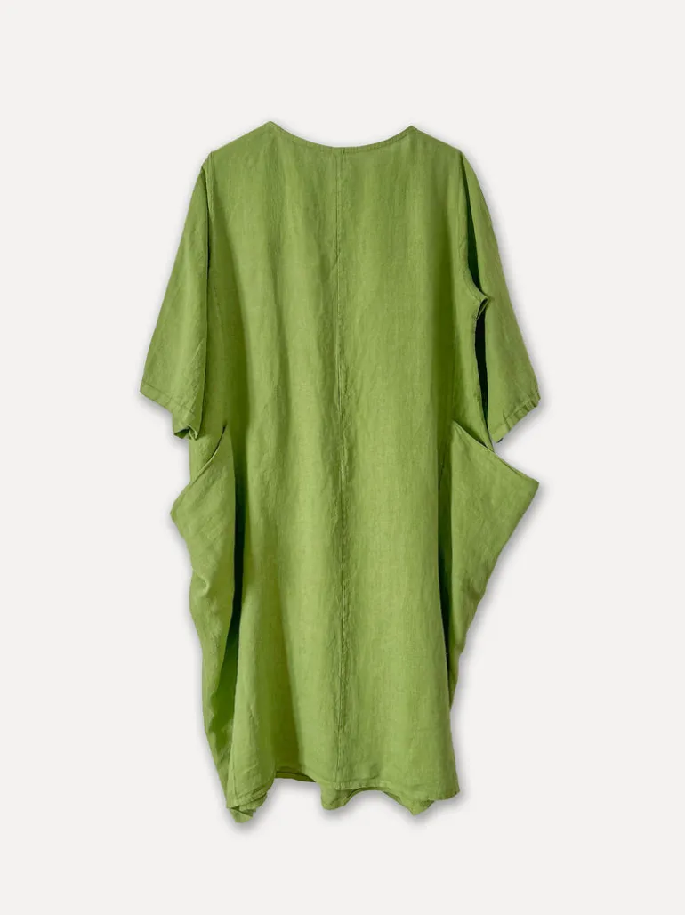 En underbart skön och lutfig linnenklänning med u-ringning, stora härliga fickor och veckad midja för ett fint fall!
