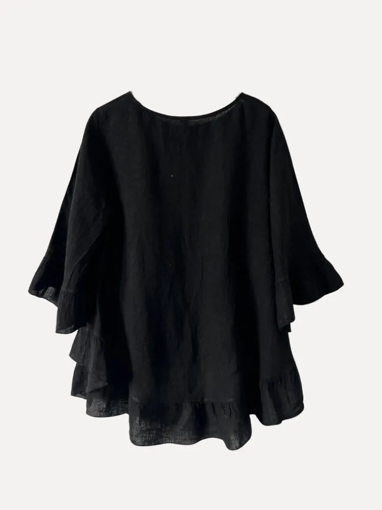 En charmig linnetopp med vackra volangdetaljer vid fållen och ärmsluten. Den runda halsringningen ger en klassisk touch, medan den luftiga passformen gör den perfekt för både vardag och fest. Finns i flera härliga färger!
