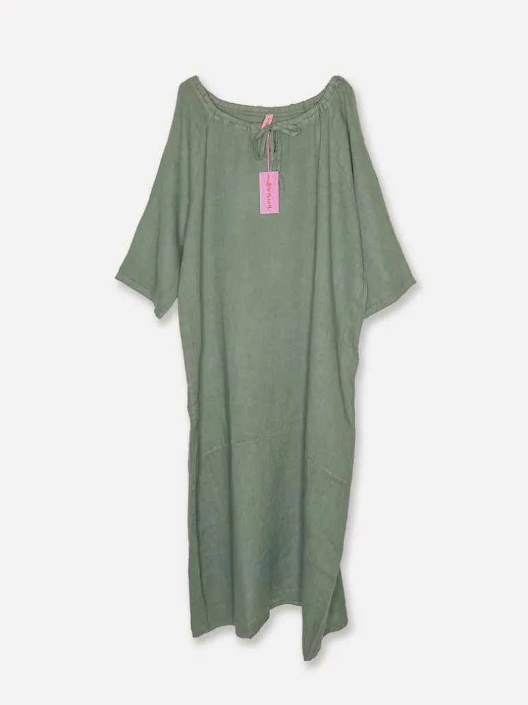 En vacker och luftig klänning i 100% linne, perfekt för både vardag och semester. Den avslappnade passformen med vida ärmar och en smickrande silhuett ger en bekväm men stylish look. Den justerbara halsringningen med knytning ger en feminin touch, medan det mjuka linnetyget ger en naturlig och elegant känsla. Perfekt för en dag på stranden eller sommarens lata dagar.