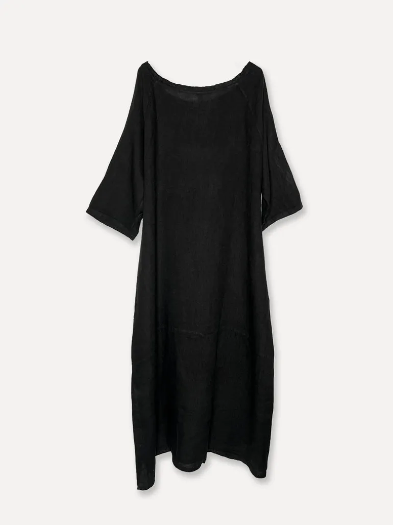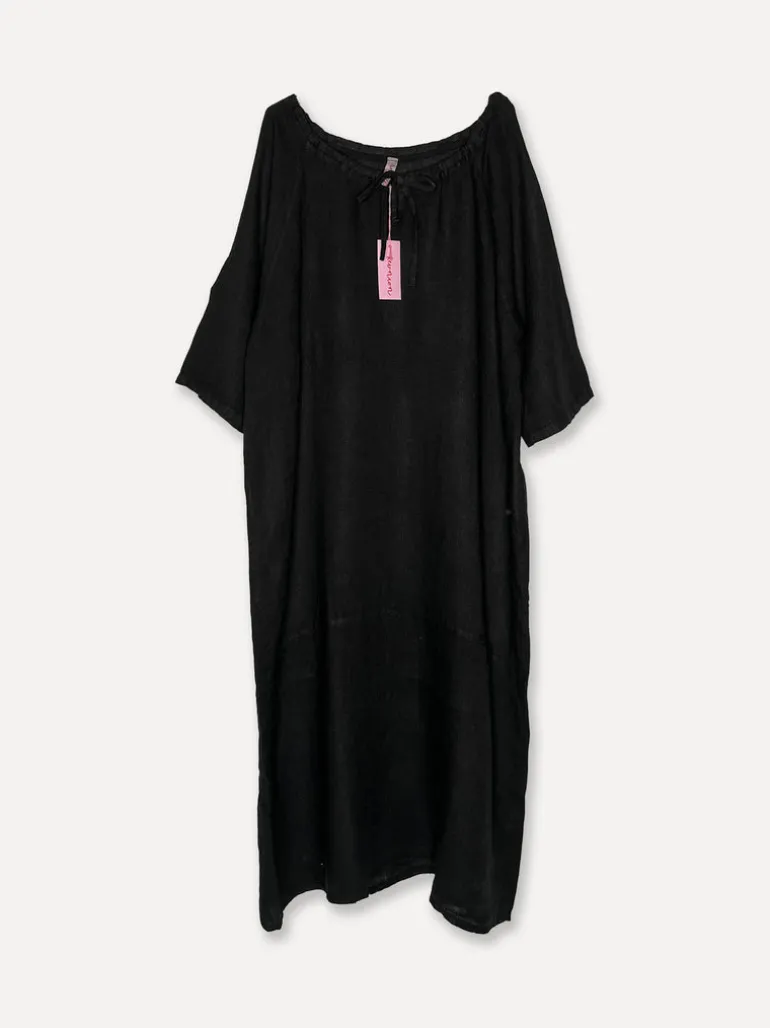 En vacker och luftig klänning i 100% linne, perfekt för både vardag och semester. Den avslappnade passformen med vida ärmar och en smickrande silhuett ger en bekväm men stylish look. Den justerbara halsringningen med knytning ger en feminin touch, medan det mjuka linnetyget ger en naturlig och elegant känsla. Perfekt för en dag på stranden eller sommarens lata dagar.