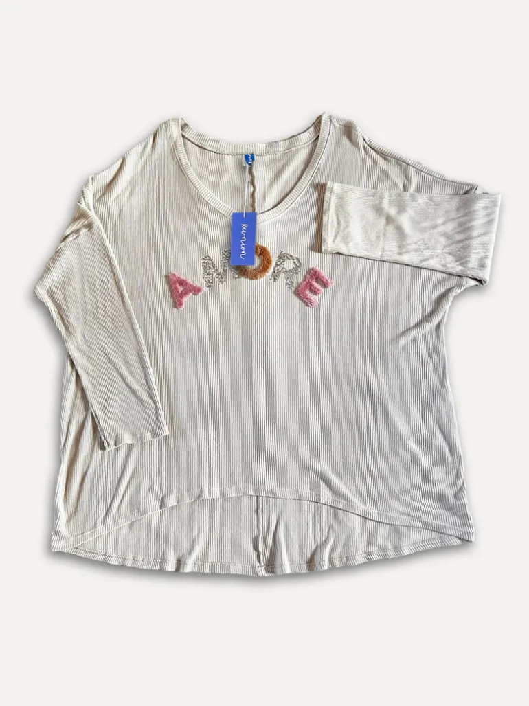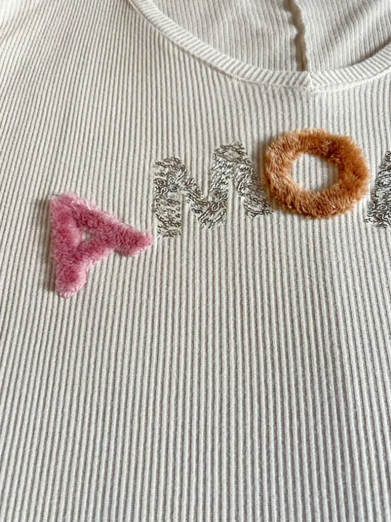 En mjuk, mjuk tröjkompis som du kommer att bo i. Stor och rymlig. One size som passar fint upp till 48/50. Bokstäverna är fina applikationer i olika material.