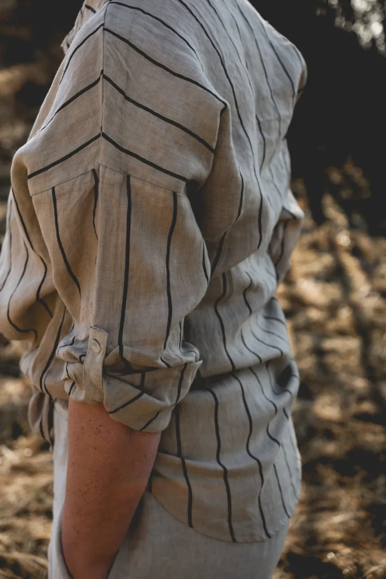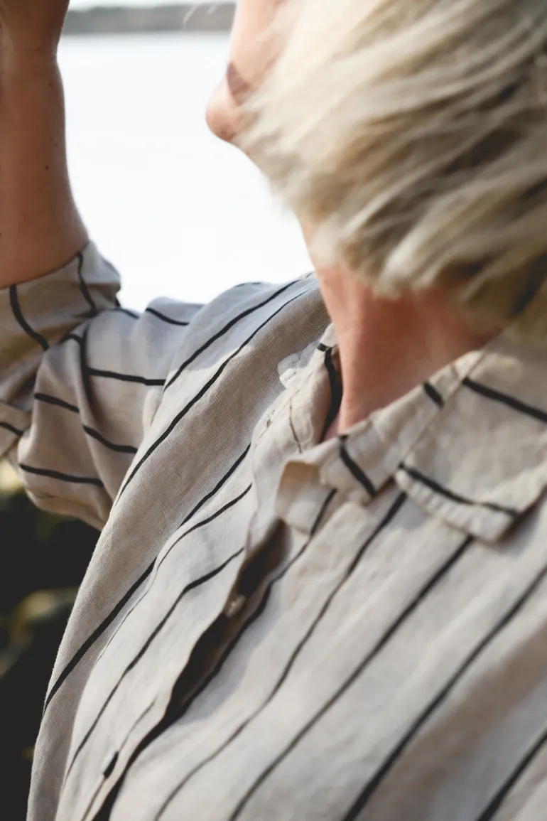 En randig skjorta. Nejnejnej… denna är den snyggaste randiga skjortan vi någonsin gjort. Det är någonting med bredden mellan ränderna som gör att vi blir lyckliga. Exklusivt. Eftertänksamt, avslappnat. Eller bara riktigt coolt. Skrynka till den rejält. Den där looken att du precis stigit upp ur soffan efter middagsluren undan solen en stund… den är slagbar. Avundsvärd rent av.