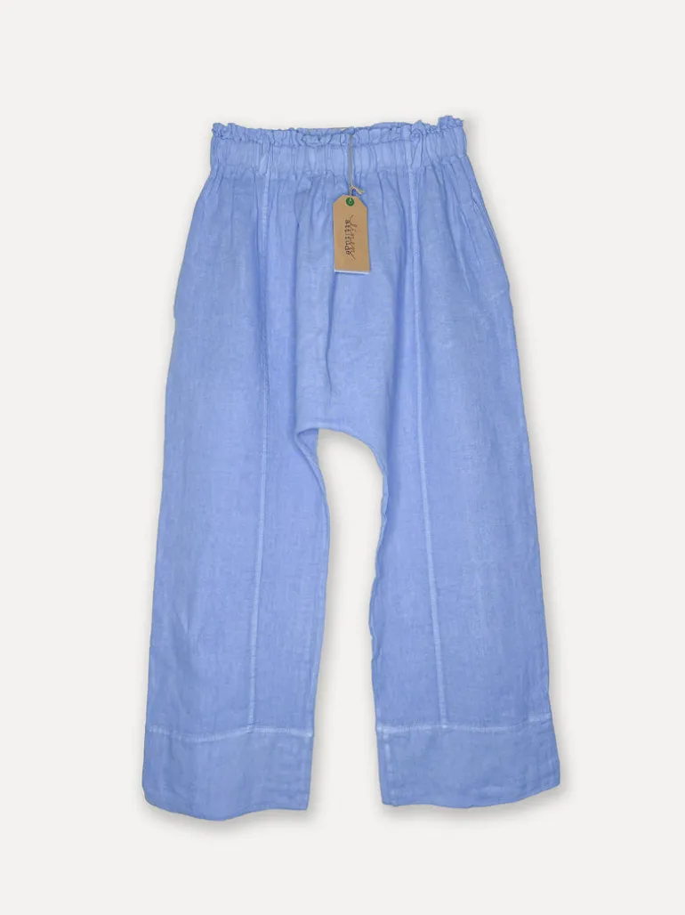 Om du gör som vi så går du från jeans på vintern till linnebyxor på sommarhalvåret. Dessa kan du använda till allt. Kort topp, lång skjorta, klänning över. Eller bara ett tunt linne till och från glasskjollen. Fickor i sidorna.