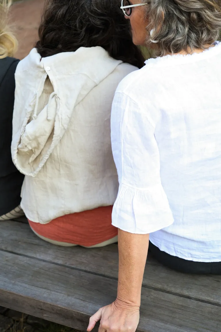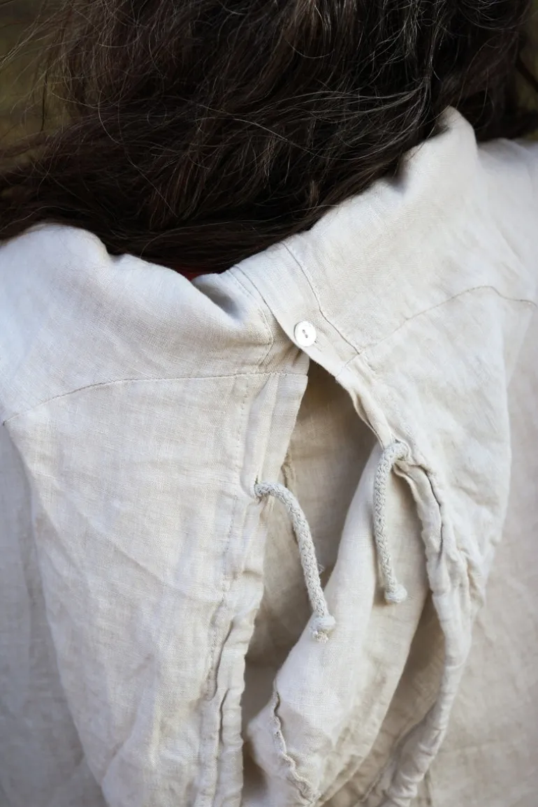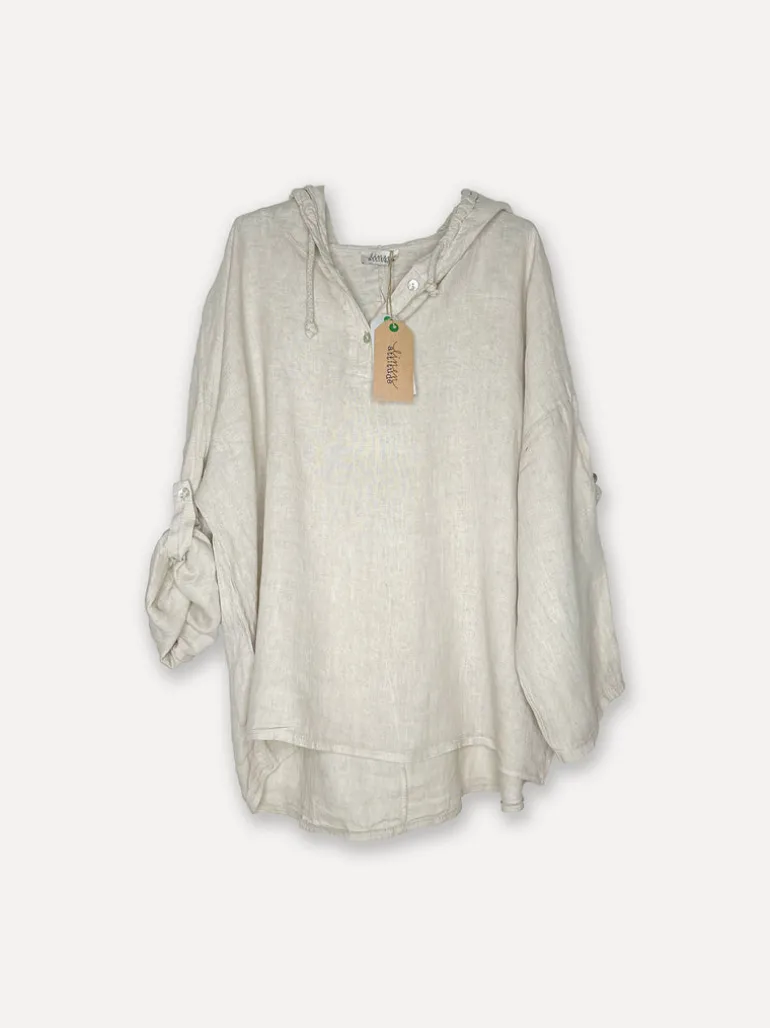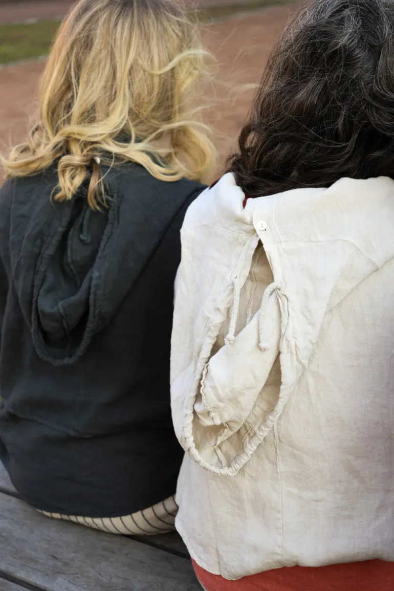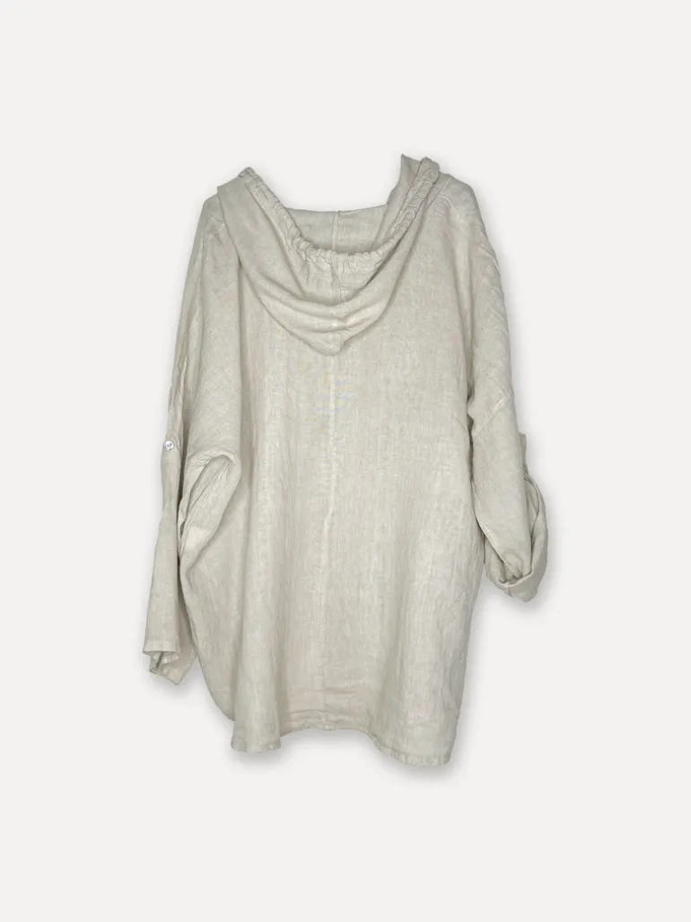 En hoodie i 100% linne. Skön, rymlig, overisized med dragsko i huvan. Ljuvlig att dra på efter en dag bland vågorna vid havet.