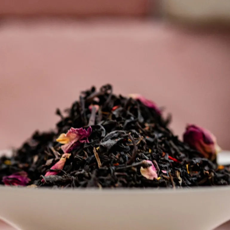 Svart te, naturlig arom, safflor, rosa rosenknoppar, röda rosenblad.