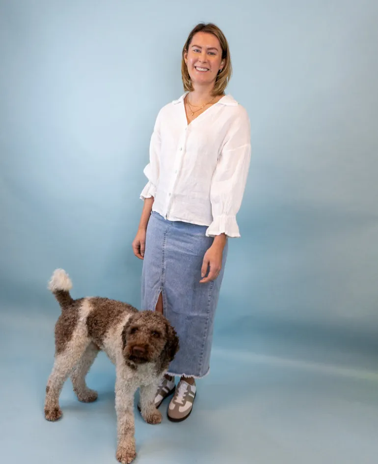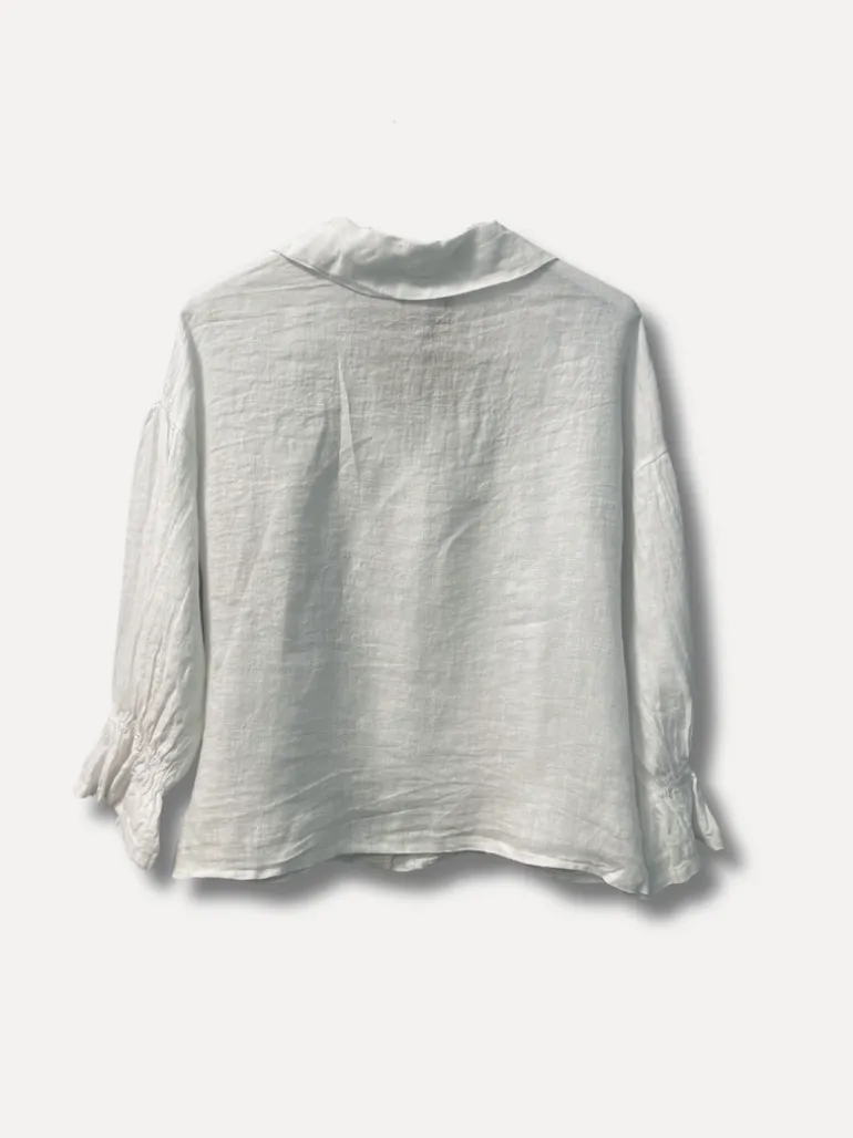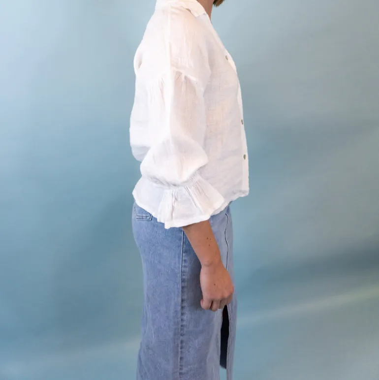 Söt linneblus med knappar längs framsidan och ärmar med lite volang i slutet.