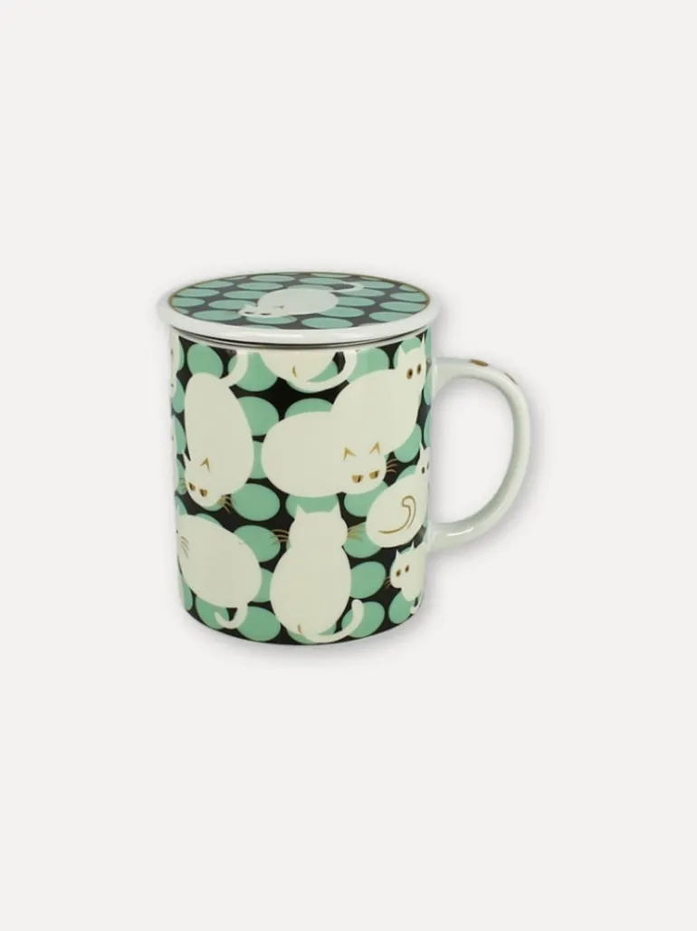 Njut av en perfekt kopp te med denna charmiga tekopp, komplett med lock och tesil. Designad med ett lekfullt mönster av vita katter (finns även med svarta katter), är denna kopp både praktisk och estetiskt tilltalande. Locket håller ditt te varmt längre, och den medföljande tesilen gör det enkelt att brygga löste direkt i koppen. Perfekt för alla kattälskare och te-entusiaster!
