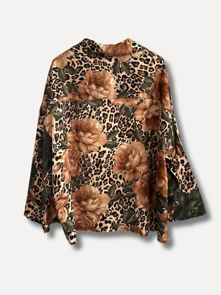 Denna sköna skjorta kombinerar två trendiga mönster – leopard och blommor – på ett unikt och stilfullt sätt. Blandningen av de vilda leopardrutorna och de romantiska blommorna skapar en spännande och iögonfallande design. Skjortan har en klassisk krage och knappstängning fram, vilket ger den en elegant och tidlös look. Materialet är mjukt och följsamt, vilket gör den behaglig att bära. Skjortan kan enkelt klä upp eller ner en outfit och passar utmärkt för både arbete och fritid.