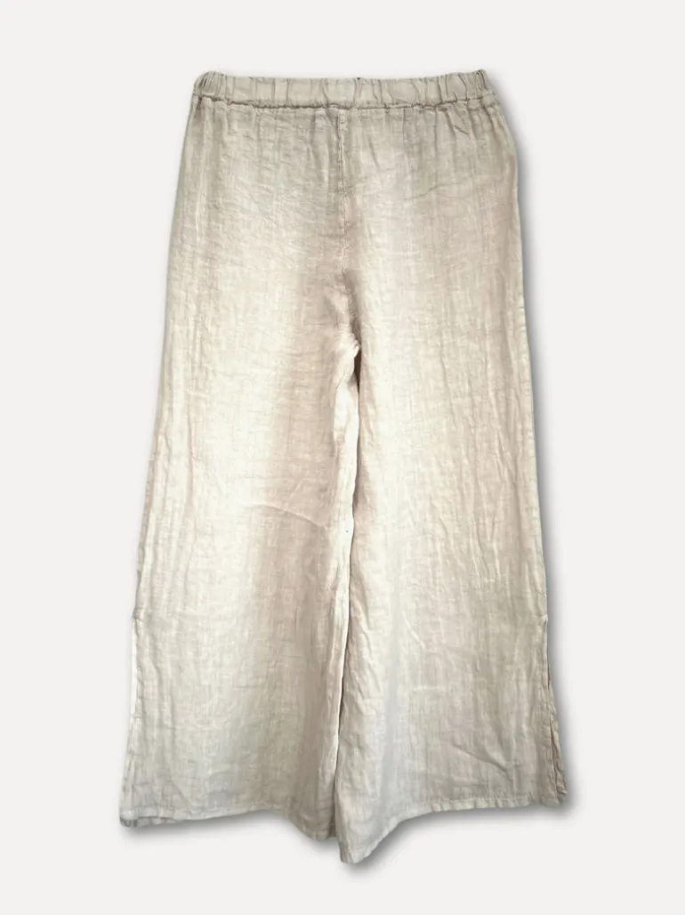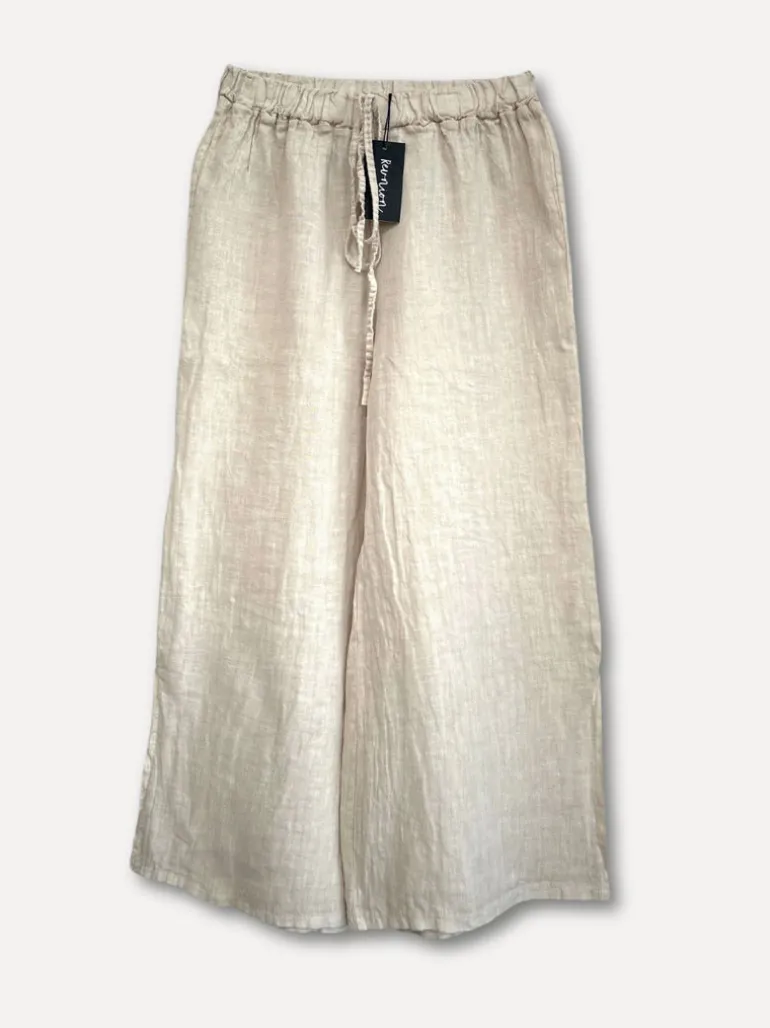 Croppade linnebyxor utan fickor och resår med knyt i midjan. Är något vida och har en liten slits på sidan av byxbenen passar 36-40