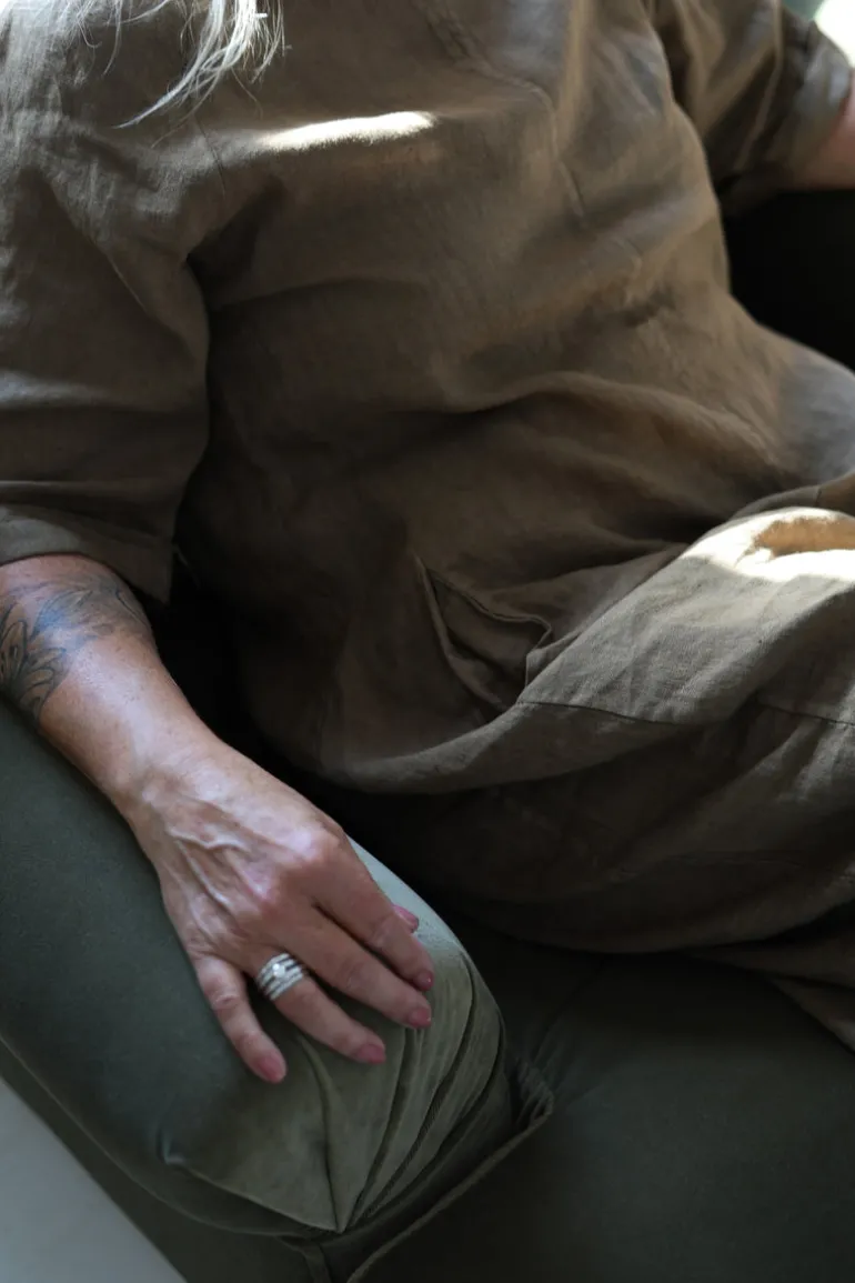 Vår fantastiska PERLA linneklänning är tillbaka i ny vinterversion. Vi har gjort ärmen lite längre. Inte så att du doppar den i kaffet, men den värmer nedanför armbågen.