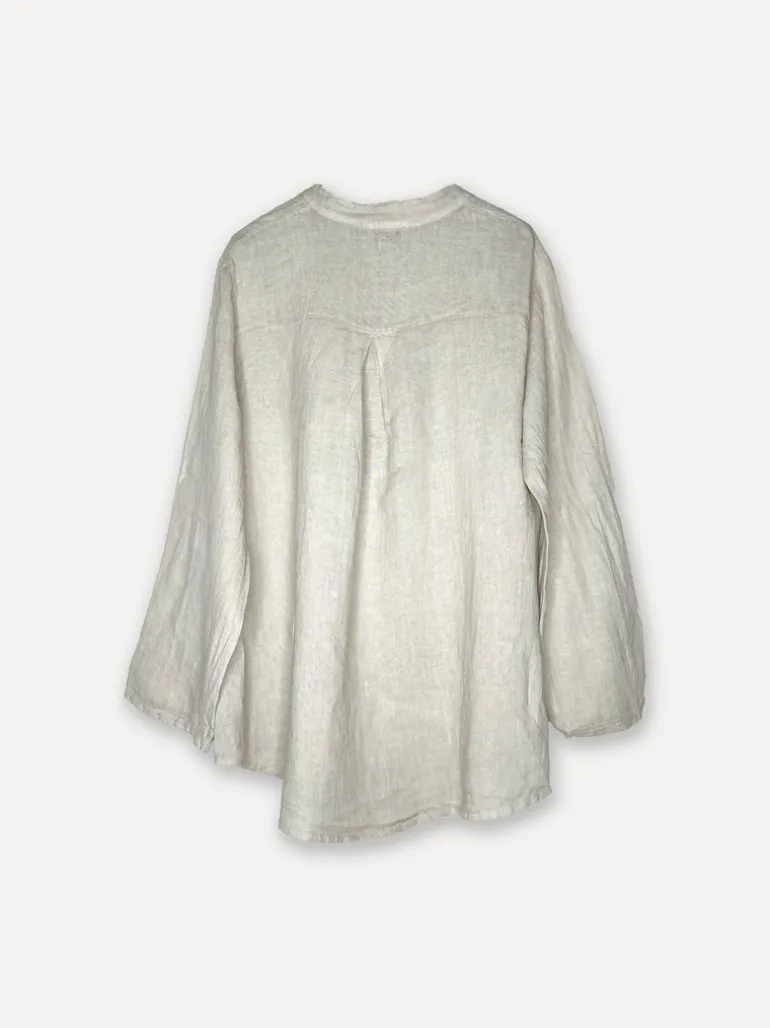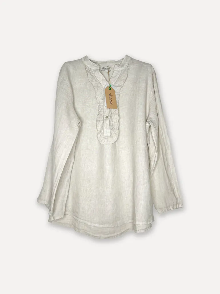 En luftig och bekväm linneskjorta med eleganta volangdetaljer vid halsringningen. Perfekt för en avslappnad men stilfull look. Finns självklart tillgänglig i flera färger.