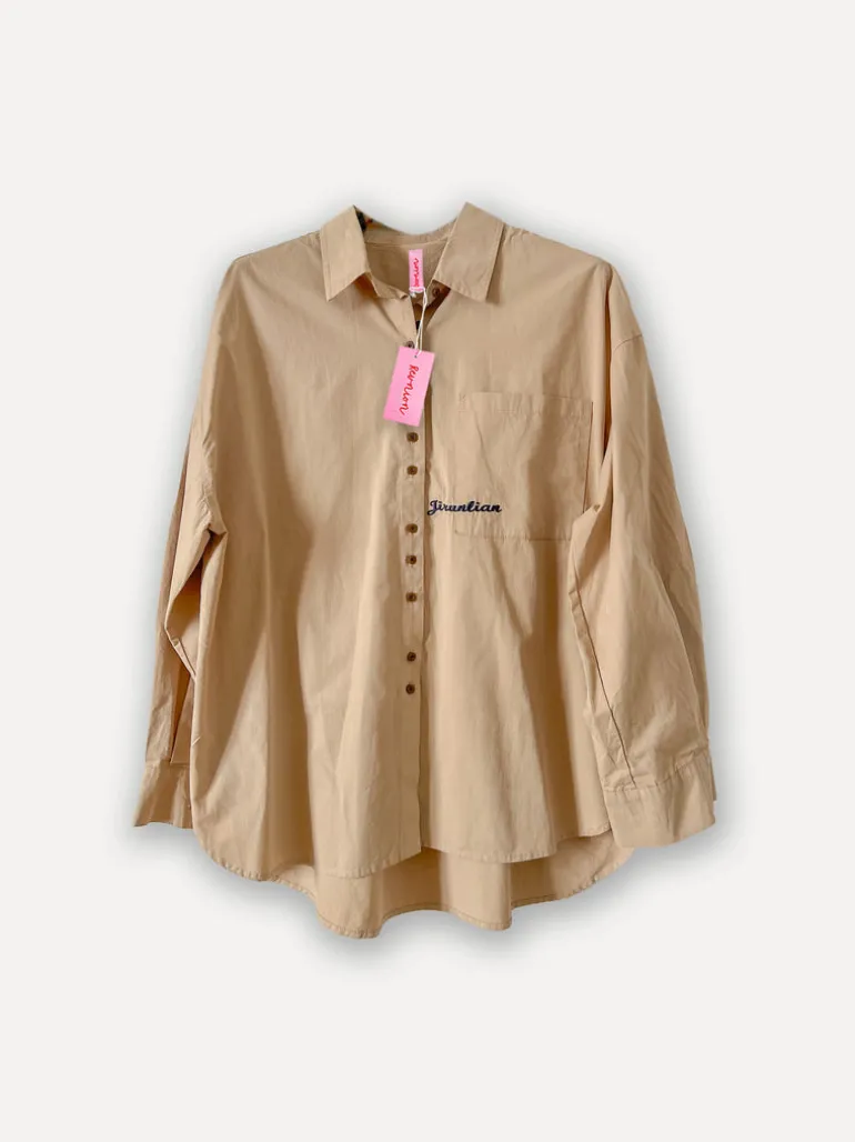Skön prasslig poplinskjorta med fina små knappar framtill. Ett namn broderat. På franska. Kanske kan du låtsas att du lånar din franska boyfriends skjorta. I vilket fall som helst, den passar både kvinnor och män. Kavla upp, bär med stolthet. En av varje färg täcker in hela vår och sommarsäsongens garderob.