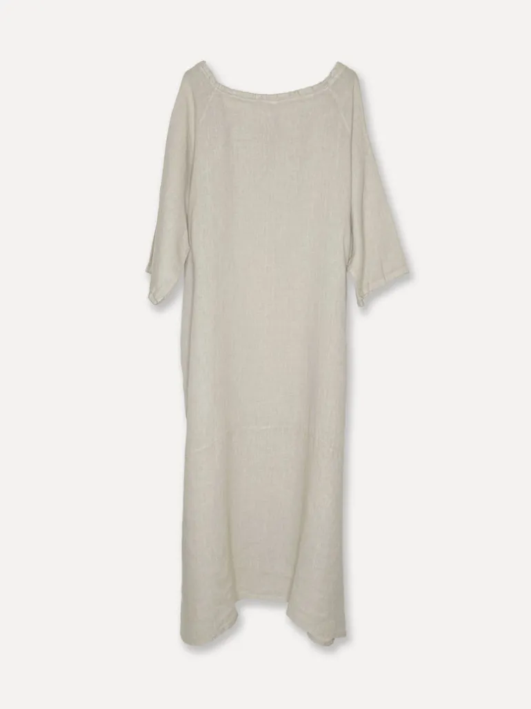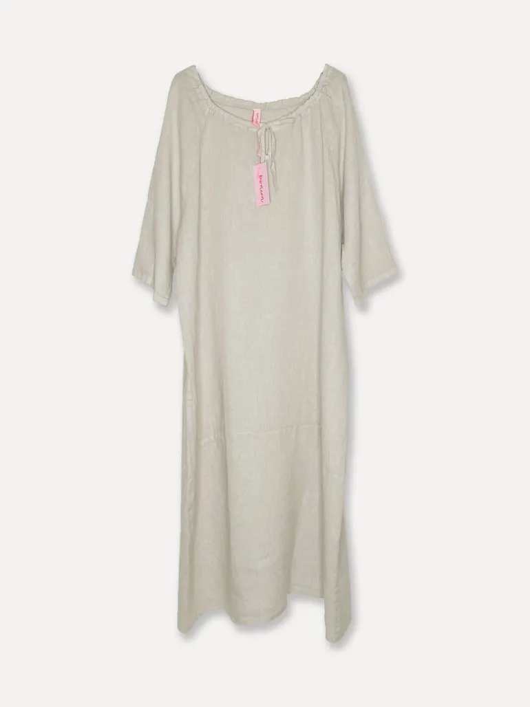 En vacker och luftig klänning i 100% linne, perfekt för både vardag och semester. Den avslappnade passformen med vida ärmar och en smickrande silhuett ger en bekväm men stylish look. Den justerbara halsringningen med knytning ger en feminin touch, medan det mjuka linnetyget ger en naturlig och elegant känsla. Perfekt för en dag på stranden eller sommarens lata dagar.